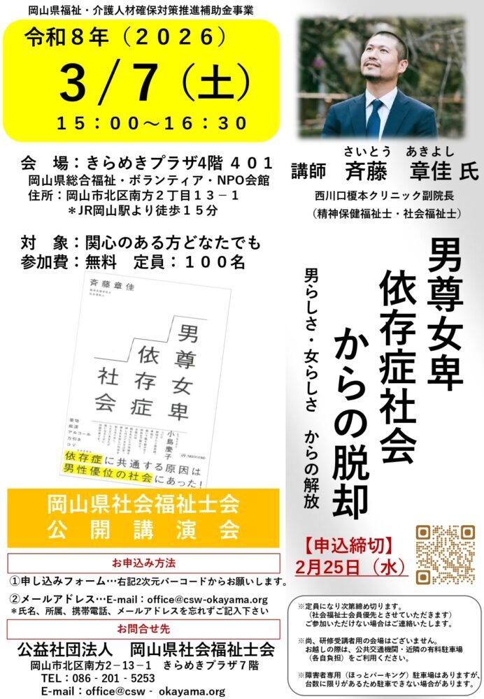 公益社団法人 岡山県社会福祉士会 公開講演会 「男尊女卑~依存症社会からの脱退」開催のお知らせ(2月25日(水)申し込み〆切)
